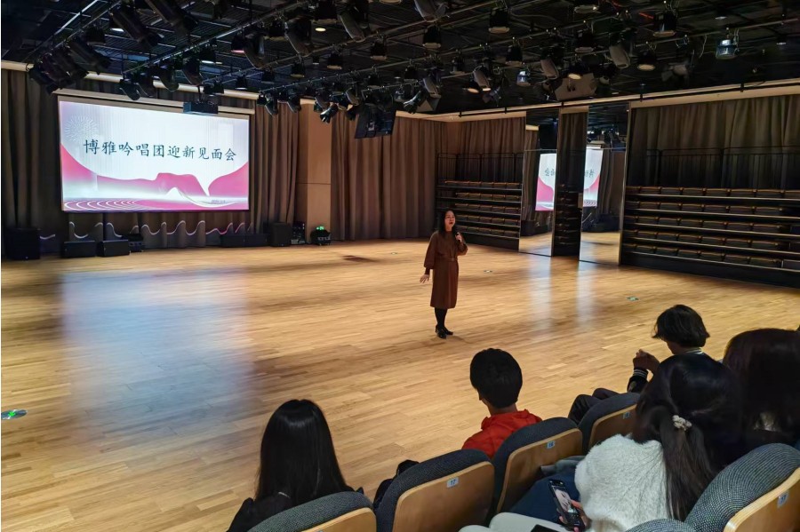 会上,高慧向团员们介绍了博雅吟唱团的历史,鼓励大家不忘初衷,秉承传承中华优秀传统文化和红色文化的宗旨,于低吟浅唱间表现古典诗词之美,在乐器弹拨间奔涌着拼搏奋斗的力量。同时,成员之间要团结协作,发挥团队力量,创新节目形式,关注节目效果,带领团队高质量发展。沈玉华主要从节目排练的角度谈了博雅吟唱团的主体节目安排和排演形式,强调在排练过程中的纪律问题,也希望团队成员能够各尽其才、群策群力,在团队中得到成长,感受到快乐。博雅吟唱团团长马睿同学主持整个见面会,她介绍了团队的现状、部门组成和各部门干部,再次重申了吟唱团的宗旨和未来发展方向。接着,乐器表演、歌曲联唱……,在欢歌笑语中体现团队的融洽气氛和团结合作的力量。