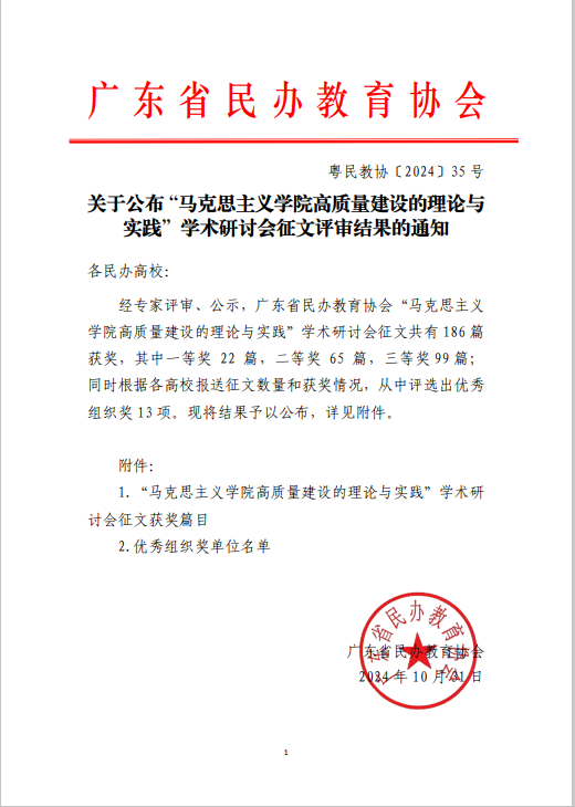 11月1日,由广东省民办教育协会主办的“马克思主义学院高质量建设的理论与实践”学术研讨会征文比赛圆满落幕。此次比赛旨在深入学习习近平总书记关于思想政治理论课建设的系列重要讲话精神,扎实推进新时代马克思主义学院高质量建设,全面提高思想政治理论课教学水平,快速提升思想政治理论课教师队伍素质。