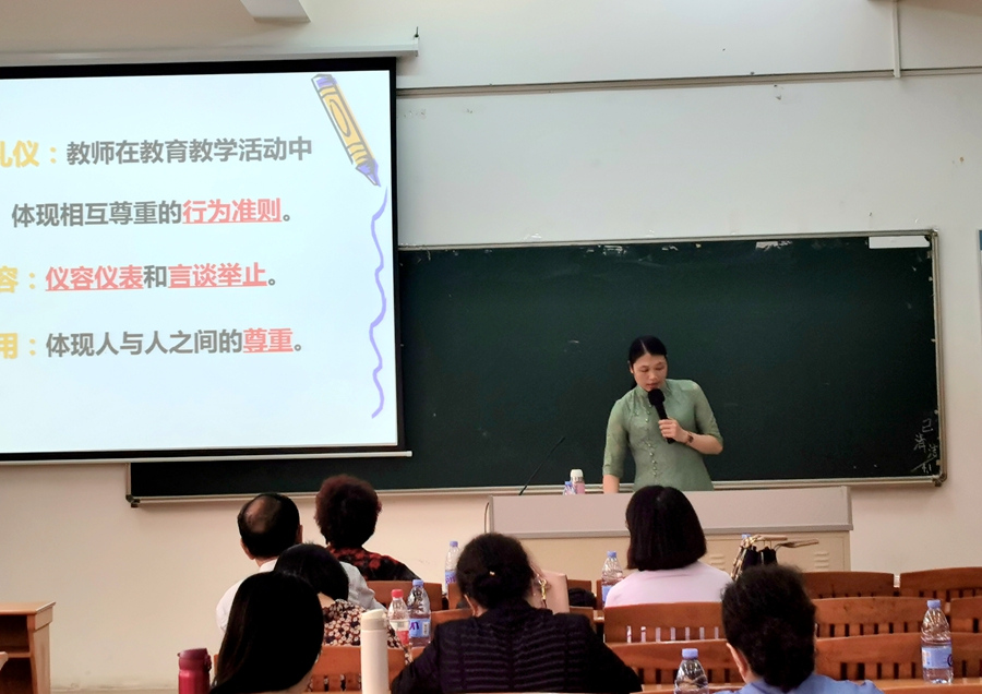 主讲教师刘宏娇,来自马克思主义学院博雅教研室。刘宏娇老师一直面向全校学生开设《社交礼仪与气质修养》课程,得到了学生一致好评。会上,刘宏娇针对男教师及女教师的仪容仪表、言谈举止、教师教态等内容分别进行了详细讲解,使与会教师受益颇深。