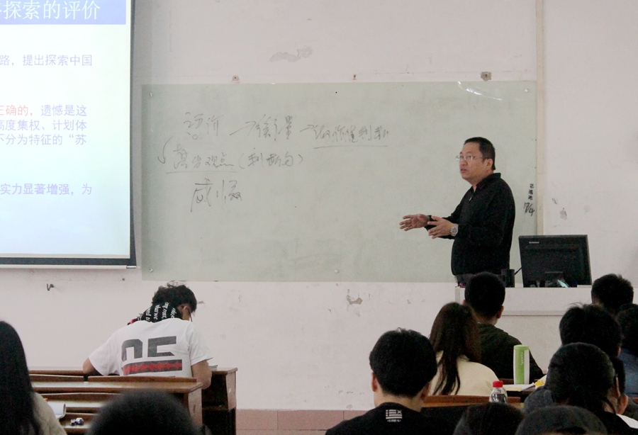 杨老师这一节课的主要内容是对中国共产党早期探索的评价。他以习近平对改革开放前三十年和后三十年的评价引入,要求同学们学会正确看待党在改革开放前三十年的探索成果。主要围绕五个方面:突破苏联模式,探索中国式社会主义建设道路的重要思想;国家经济实力显著增强,为改革开放奠定扎实基础;社会建设齐头并进,文化教育科技取得巨大成绩;外交成就显著;正确看待早期探索的失误。课间吕泉荣和杨竞业老师进行了交流和探讨,肯定了杨老师扎实的理论功底,深入浅出的讲课风格,并指出课堂理论教学只有紧密结合大学生的现实关切,才能接地气,才能吸引大学生的学习兴趣。权麟春和杨竞业老师就教学进度和课堂管理进行了沟通。