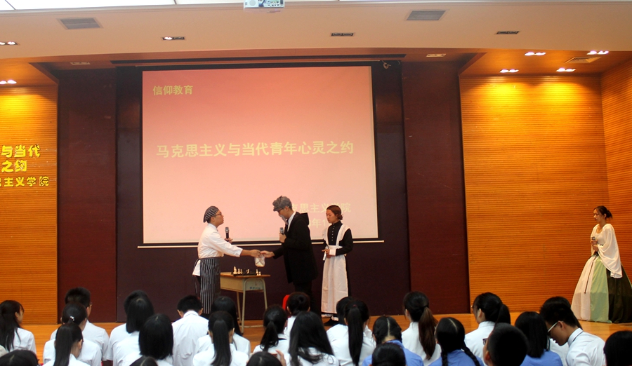 为了纪念马克思诞辰200周年,提高学生的马克思主义理论水平,坚定学生的马克思主义信仰,我校马克思主义学院于11月15日在四教第一报告厅举行了一场别开生面、妙趣横生的“马克思主义与当代青年心灵之约”活动。马克思主义学院院长权麟春教授,副院长王相东、余九林,全体思政课老师,参赛选手和460多位马克思主义信仰教育研习班学员参加了此次活动。