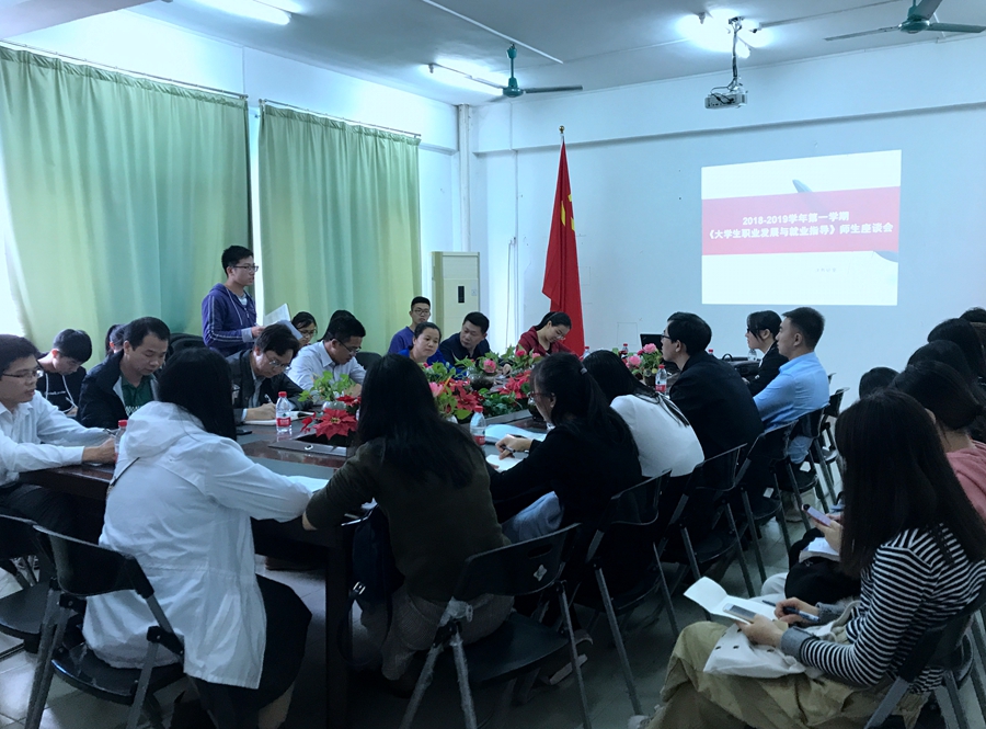 11月2日中午,大学生就业指导课教学团队在实训楼221会议室召开2018-2019学年第一学期期中师生座谈会。马克思主义学院副院长余九林、学生处副处长胡桂花,全体任课教师及30名学生代表参加了座谈会。会议由胡桂花主持。