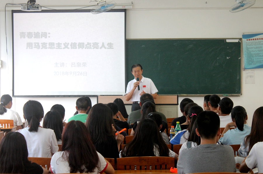 根据省教育厅有关文件精神,学校领导高度重视,9月26日下午,学校党委书记吕泉荣为2018级部分新生讲授以“用马克思主义信仰点亮人生”为主题的思政课。马克思主义学院院长权麟春、副院长王相东、余九林以及各处、二级学院部分领导共同聆听了这堂课。