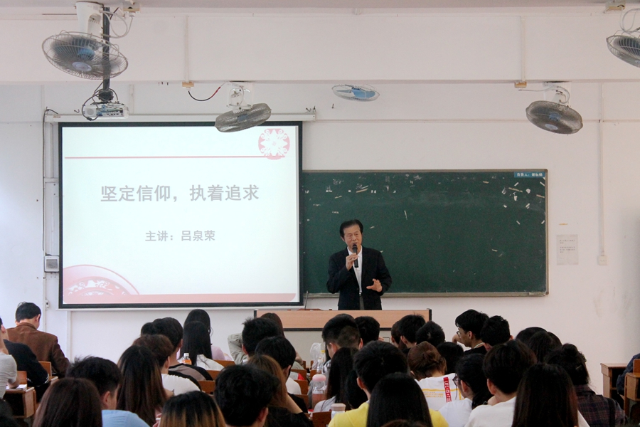 吕泉荣围绕“坚定信仰,执着追求”的主题带领在座师生翻开历史的卷轴,通过讲述长征精神、“两弹一星”元勋钱学森、感动中国人物等一系列历史事件和人物事迹,展示来自信仰的力量;通过重温中国信仰的发展史、中国的变化等方面,与师生共同领悟信仰的真谛;最后,他引导同学们用信仰构建人生的坐标,追求有信仰的人生,发挥信仰自我教育作用。“不是杰出者才做梦,而是善梦着才杰出”,“青年兴则国家兴,青年强则国家强”,告诫同学们一定要正确对待顺境与逆境,树立正确的世界观、人生观、价值观。课堂上,他举例丰富,谈古论今,课堂气氛活跃,学生听课态度认真,能够积极思考。
