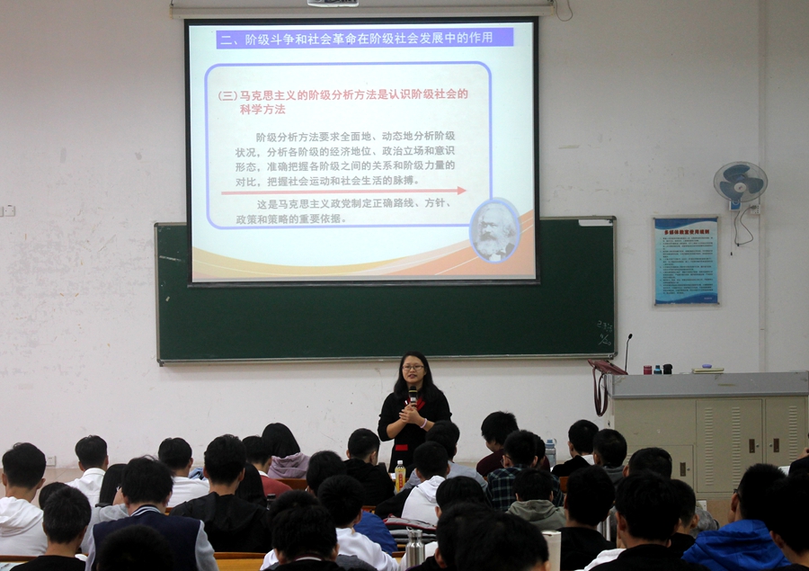 黄亚丽老师主要讲授《马克思主义基本原理概论》课的“马克思主义的阶级分析方法是认识阶级社会的科学方法”、“社会革命的实质和作用”、“改革在社会发展中的作用”三个方面的内容。她通过课前布置的作业讨论引申到本次课堂教学内容,使用历史人物事件与学生讨论的方式让学生结合教学内容展开思考,更加有利于学生深刻地把握教材知识点,并引导学生坚持科学方法评价历史人物。她与学生充分互动,使课堂气氛活跃,带动学生深度融入课堂。