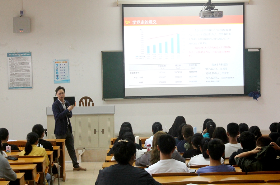 为加强大学生的思想政治教育和推进党史教育,我校按省教育厅的工作部署,由马克思主义学院统筹安排,认真开展落实书记、院长上好“思政第一课”工作。2021年10月13日上午四教508课室,副校长李锦堂为2021级法学2班的学生讲思政第一课,题目是“学党史,强信念,跟党走”。