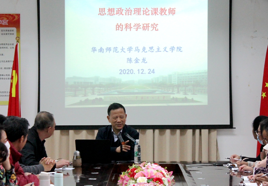 12月24日14时30分,华南师范大学马克思主义学院院长 、教授、博士生导师陈金龙教授来我院作思想政治理论课教师科学研究的专题讲座。讲座由马克思主义学院院长李洪君教授主持,马院全体教师和护理学院思政部教师集体参加学习。