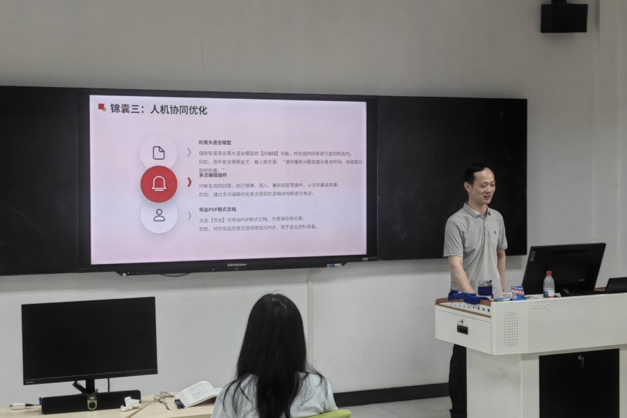 数字赋能:AI助力思政课革新。院长助理王相东现场演示数字化教学工具应用:智能备课-基于“匠帮AI”生成人机协同教案;场景创新-运用“腾讯智影”打造虚拟教学助手;资源提质-通过“通义万相”智能设计教学图谱。学院计划开展“AI+思政”专题培训,推动数字技术深度融入教学全流程。