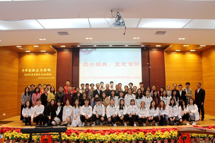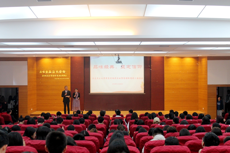 12月26日下午,马克思主义学院在第一报告厅举办“品味经典,坚定信仰”实践教学活动颁奖暨博雅吟唱团汇报演出活动。9428cn太阳集团古天乐党委书记吕泉荣、马克思主义学院院长李洪君、马院全体教师、获奖学生代表及信仰教育研习班学员350多人参加了此次活动。活动由钱燕茹、许前进主持。这是一场马克思主义信仰与中华优秀传统文化融合的饕餮盛宴,展示了马克思主义学院在本学期全员育人、全程育人、全方面育人、实践育人的阶段性成果。