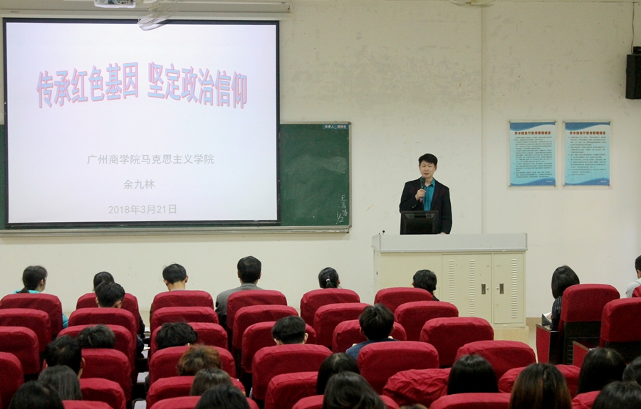 3月22日下午,马克思主义学院副院长余九林在四教210讲授以“传承红色基因,坚定政治信仰”为主题的新学期“思政第一课”。学院全体思政课教师以及部分学生到场听课。